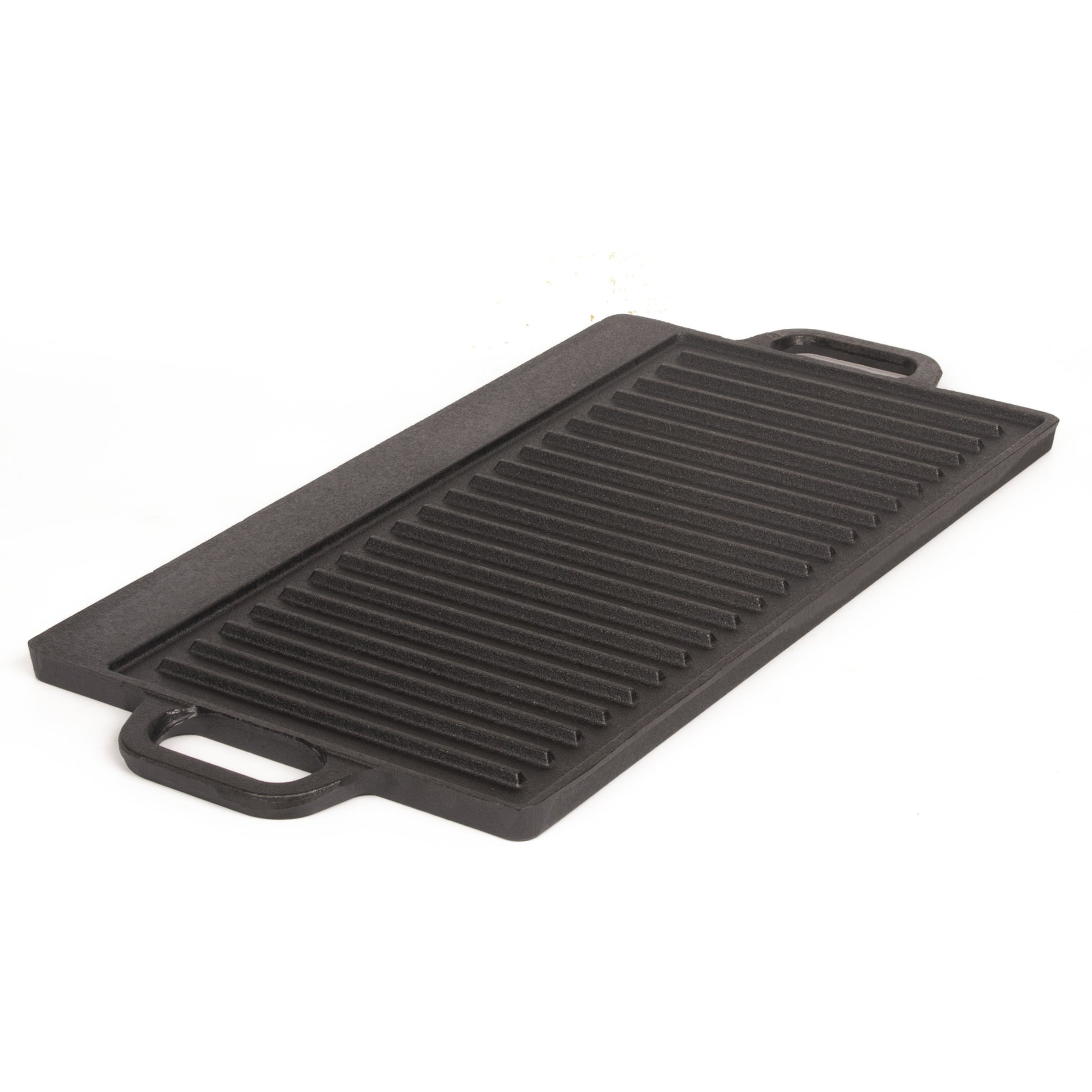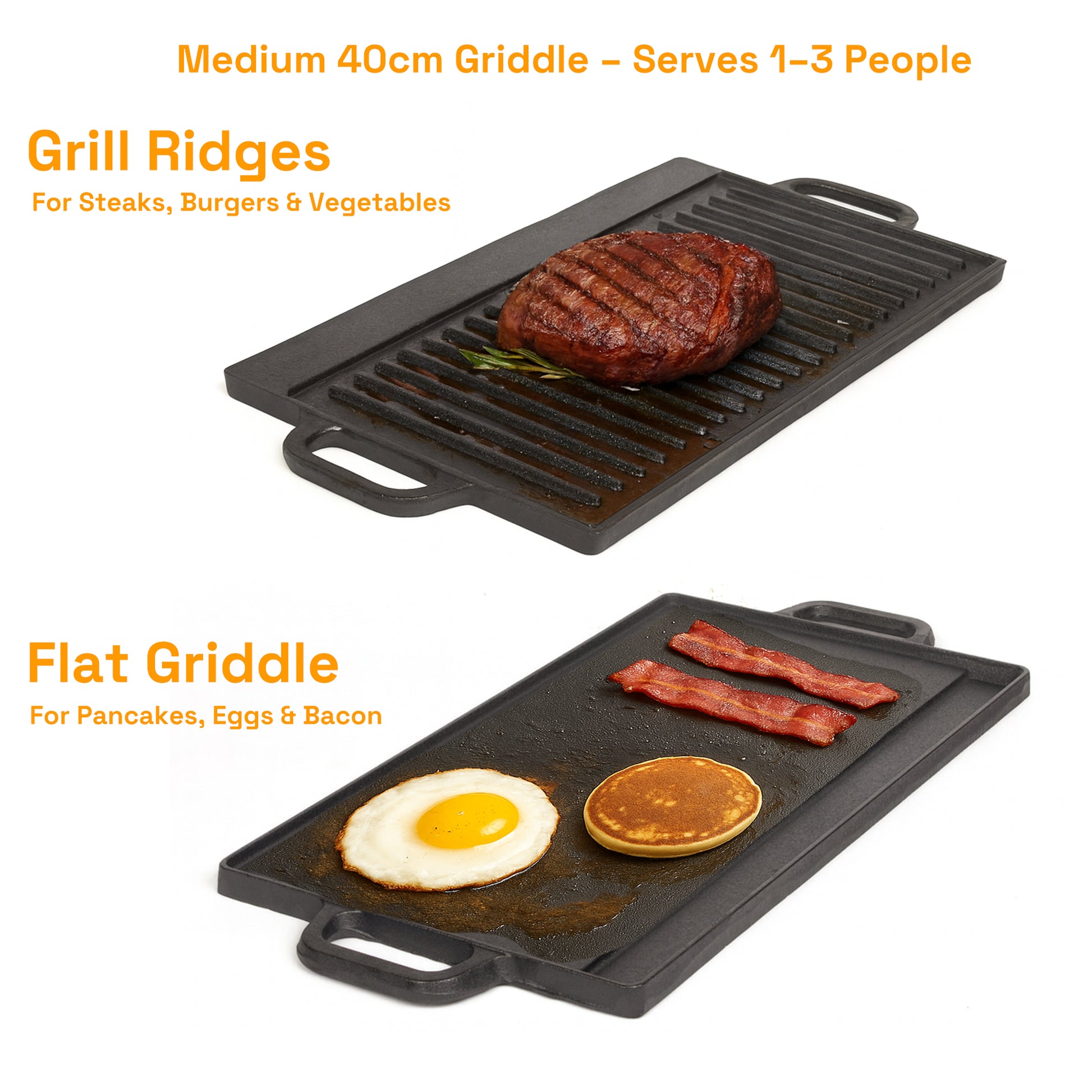 40 cm Reversible Cast Iron Grill & Griddle -Dual-Sided (Flat & Ribbed), Pre-Seasoned, Handles, for Stove-Top & Outdoor Use