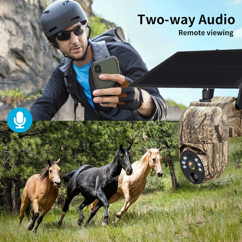 Blend security seamlessly into your natural surroundings with this 4MP Solar Powered PTZ Camera featuring a unique camouflage wood-grain design. Ideal for monitoring Australian gardens, driveways, farms, or properties with established trees, this camera offers discreet surveillance without the need for complex wiring. Powered by a high-efficiency solar panel and rechargeable batteries, it ensures continuous operation even in remote locations around your home.