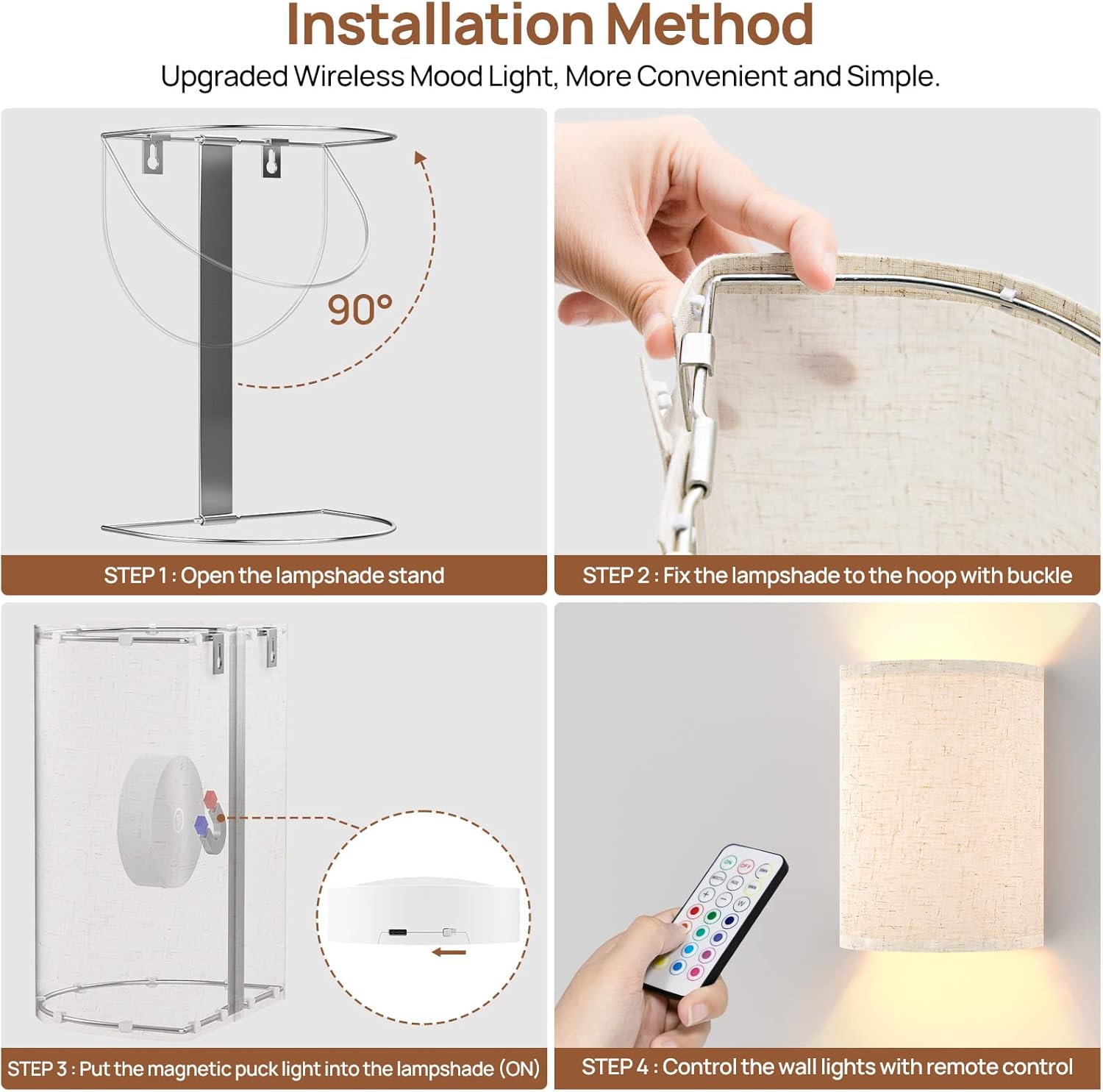 - [Magnetic Connection Easy to Install] Our modern universal battery-operated wall sconces were no hard wires and no cords. A truly wireless wall sconce with magnetic puck lights, which are vertically magnet on the mounting plate, so that the lampshade has no shadow and the light is more uniform. Easy to take it off, and charge it at any time.