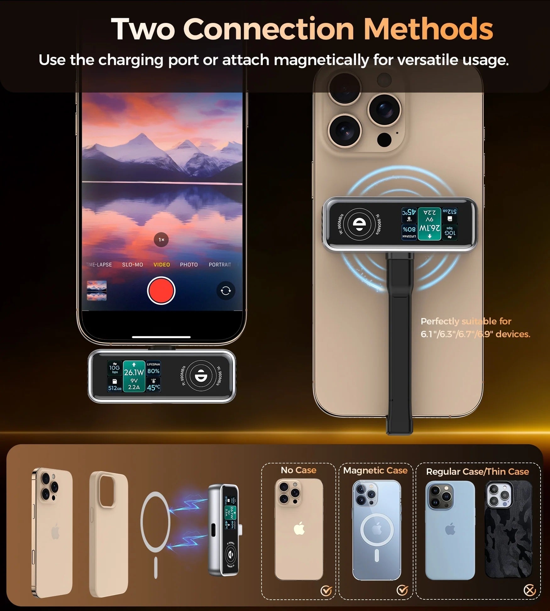 Features a right-angle Type-C cable and MagSafe attachment, ensuring a secure connection at up to 10Gbps with devices sized 6.1", 6.3", 6.7", and 6.9".