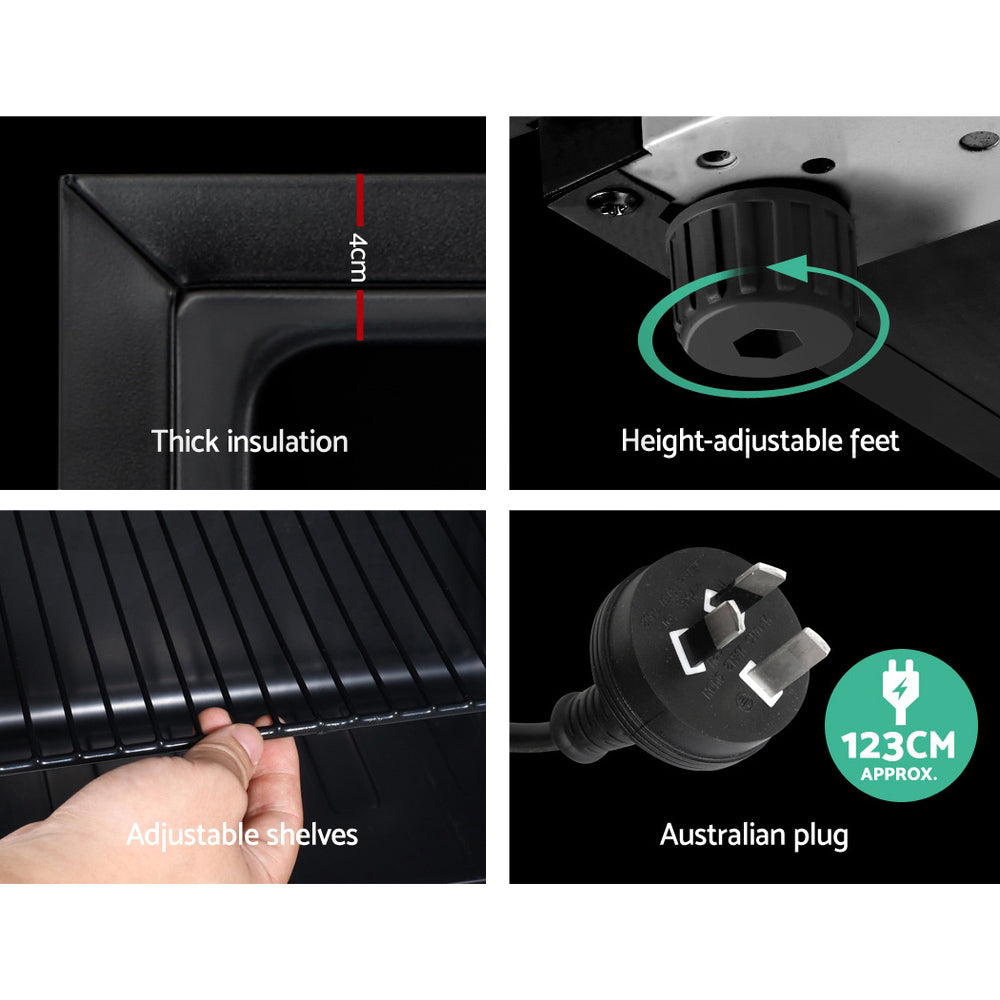 The portable Devanti Bar Fridge is great for keeping a variety of food and beverages chilled and cooled and without taking up too much space. Designed with five temperature settings, the energy-efficient bar fridge lets you set your desired coolness and freshness. Other great features include adjustable shelves, double-glazed door, height-adjustable feet, built-in handle, and consistent refrigeration to name a few. The compact bar fridge is also totally eco-friendly with its R600a freon-free refrigerant and well-made for robust use, such as the PVC door seal gasket, extra thick insulation and a built-in LED lamp (only for 70L model) to ensure operation is smooth, quiet and hassle-free. Whether you use it as a secondary fridge or a mainstay, the Devanti bar fridge is a cool investment time and again.
