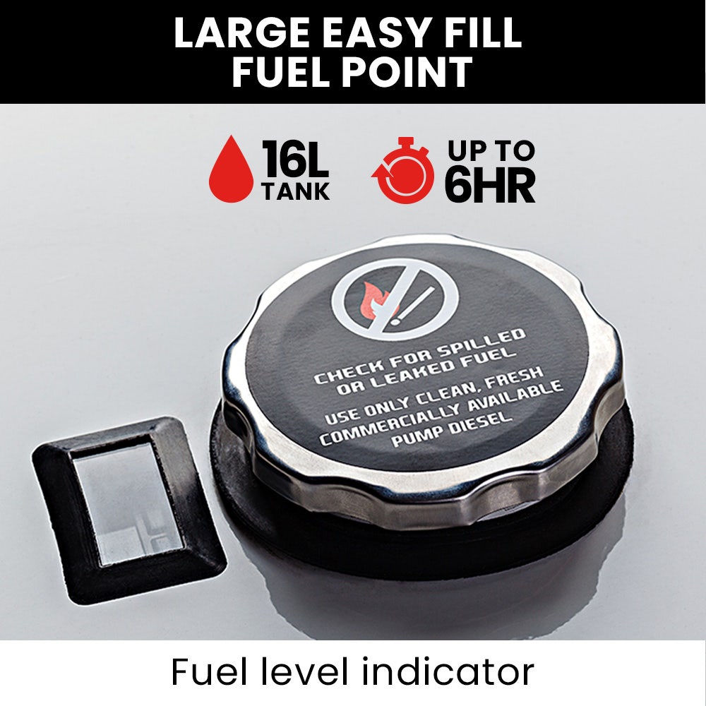 With a powerful 13HP engine, copper-wound alternator and 6000W rated output, it's ideal for worksites, warehouses, farms or where mains power is temporarily unavailable. The rugged 3mm steel enclosure, oversized battery, and large fuel tank ensure long-lasting performance. Easy electric start, dual swing doors and roller wheels make operation and maintenance simple wherever power is needed.