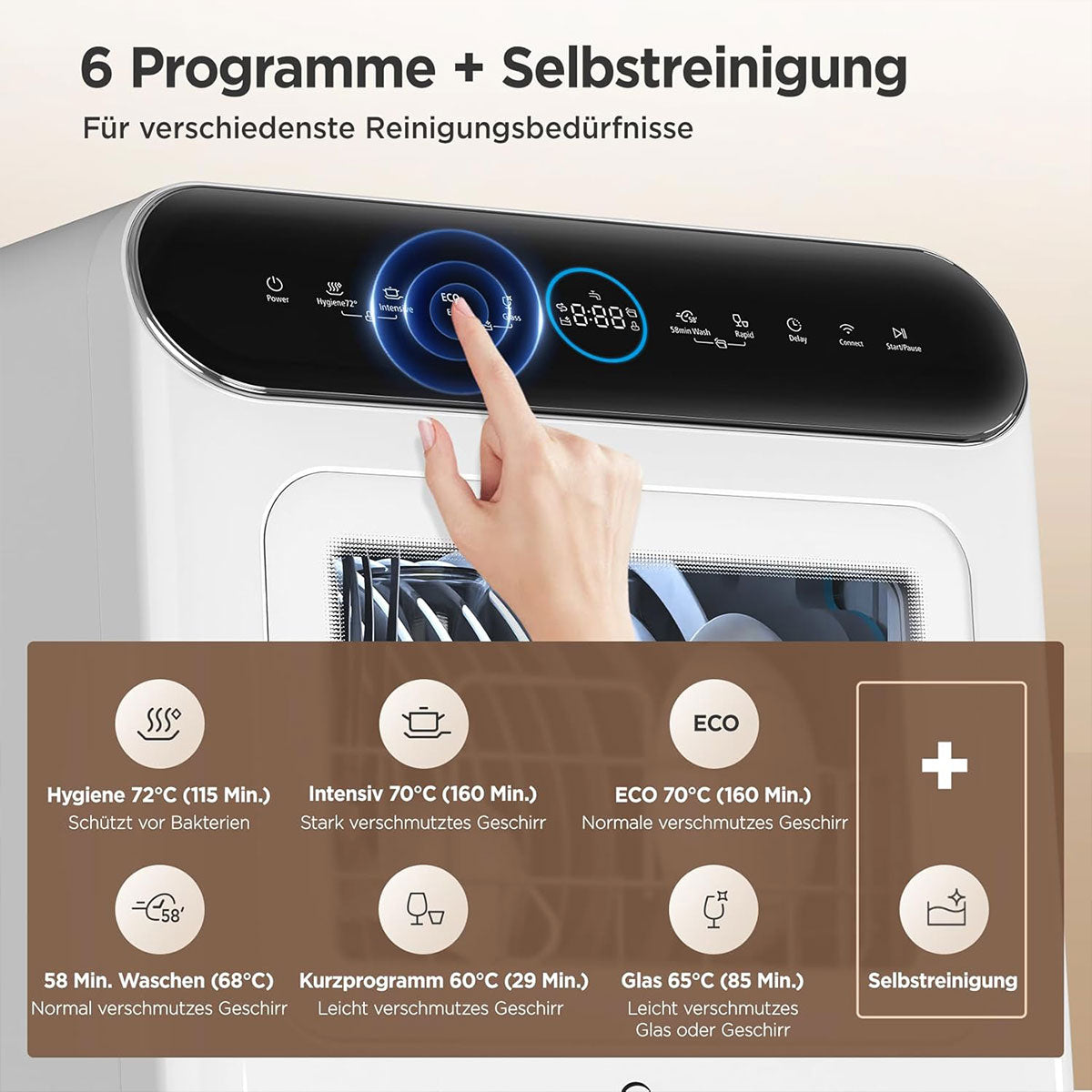 Feature: No plumbing required Auto open door 3 place setting 7 wash programs Steam function Hygiene 72 wash Rapid 29 min wash Insulated water tank Program: Hygiene72, Intensive, ECO, Glass