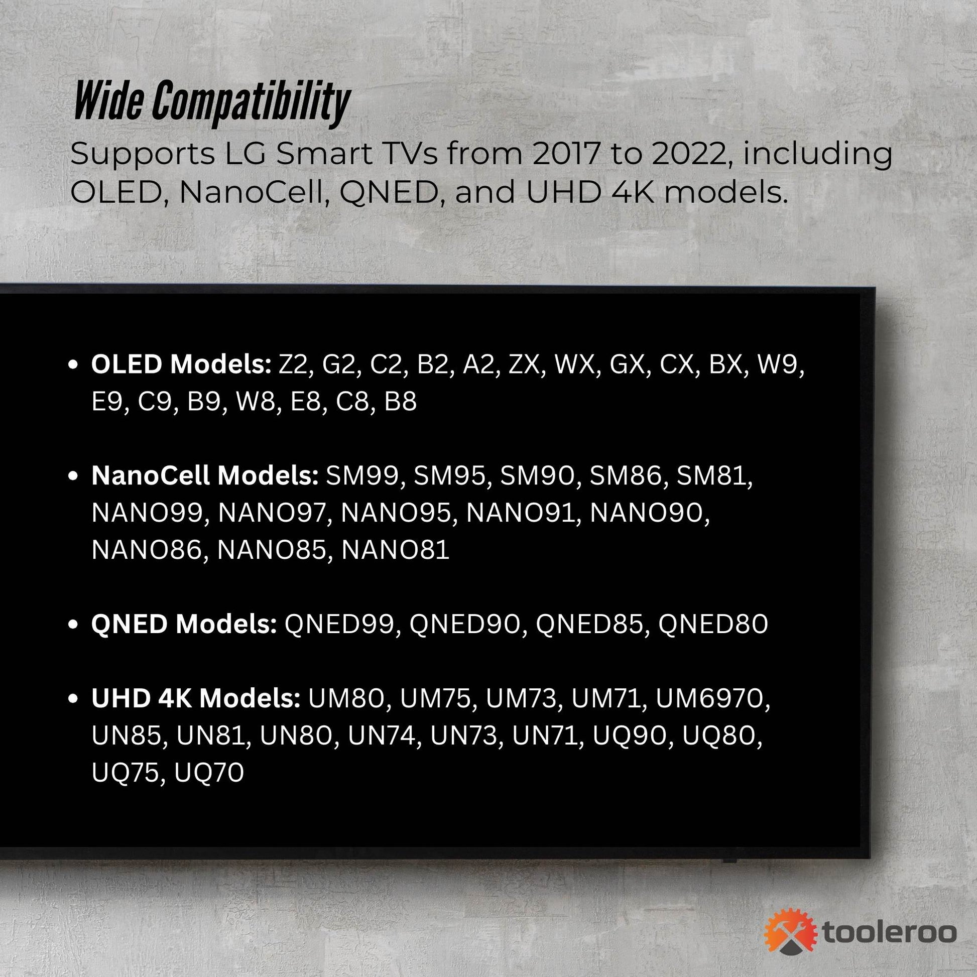 - Wide Compatibility: Supports LG Smart TVs from 2017 to 2022, including OLED, NanoCell, QNED, and UHD 4K models.