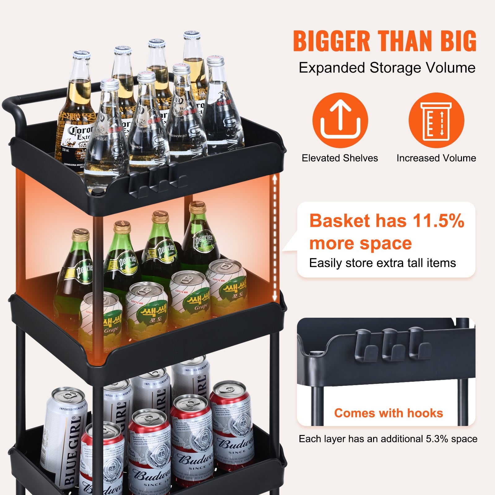 Experience expanded storage space with our newly upgraded rolling cart! Featuring an increase in height, each shelf provides 5.3% more space with 11.5% more basket space. Whether it's bulky items or little knick-knacks, you can store them all. Plus, extra hooks mean more hanging space _ talk about convenience!