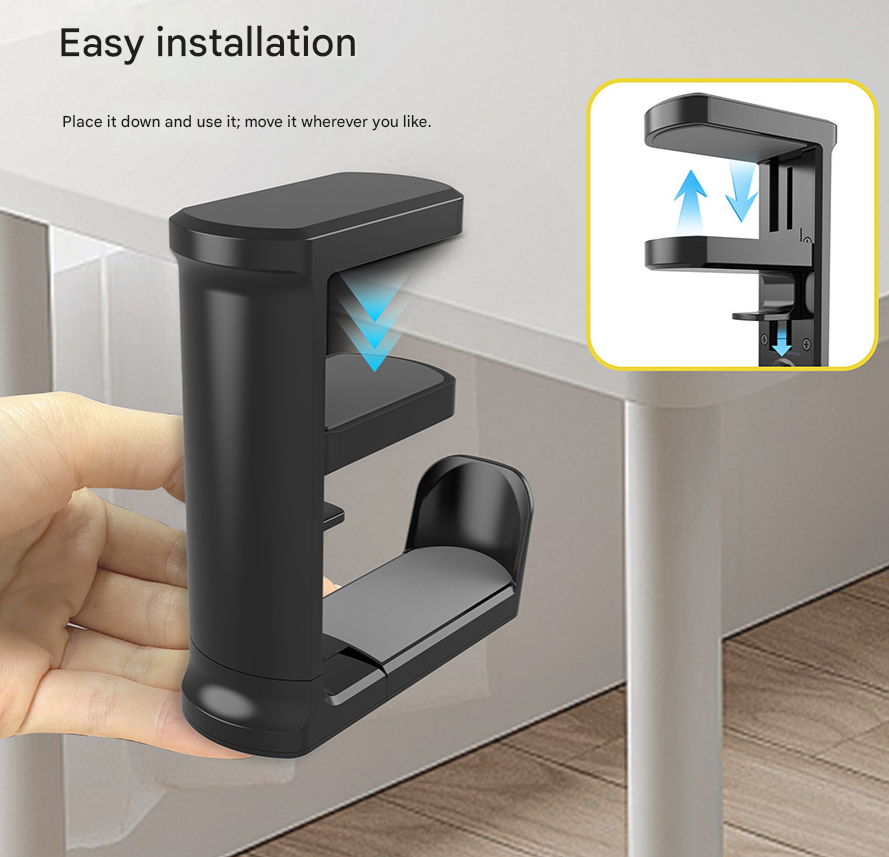 Optimise your workspace with this versatile rotating headphone mount. Constructed from durable materials, it offers a sturdy resting place for your audio gear. The intuitive design features a "clamp-on" system that can be easily attached to the edge of most standard Australian desks. Once installed, the rotating mechanism gives you the flexibility to store your headphones discreetly underneath the table, keeping your setup looking clean and professional.